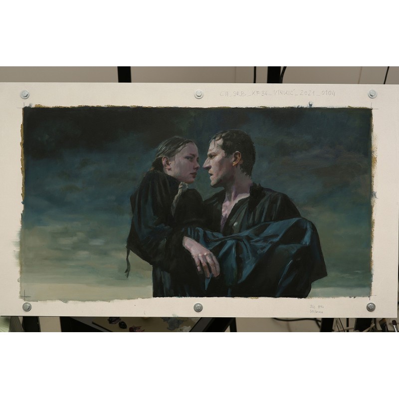A key frame painted for scene 033 by one of the supervisors at our studio in Serbia. It perfectly captures the likeness of the actors while maintaining a free painting style. Unlike the frame from the animated shot (the frame is no longer available in our offer), there is no rain painted here. An extremely valuable, one-of-a-kind painting and a real treat for collectors.