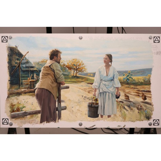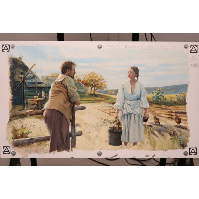 The first opening shot, from scene 040, in front of Dominikowa and Jagna's house. Matthew, who found out about Jagna's possible marriage to old Boryna, decided to talk to her. The shot was recorded on set, in a studio (against a green background), with only a fragment of a wooden fence serving as the set design. The rest of the frame was created as a digital set design, mainly inspired by Apoloniusz Kędzierski's painting “Girl with a Jug.” In the background, we see the gentle hills surrounding the village, and at the edge of the field, ripe sunflowers from Jan Stanisławski's paintings.