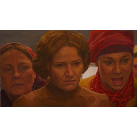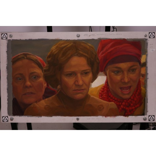 A shot from the dynamic and emotional scene of Jagna's lynching. The short shot shows the moment when Zośka beats Jagna. Three women visible in the frame watch this with rage in their eyes. Although short, it was quite difficult to animate this shot — a moving camera and three large portraits.