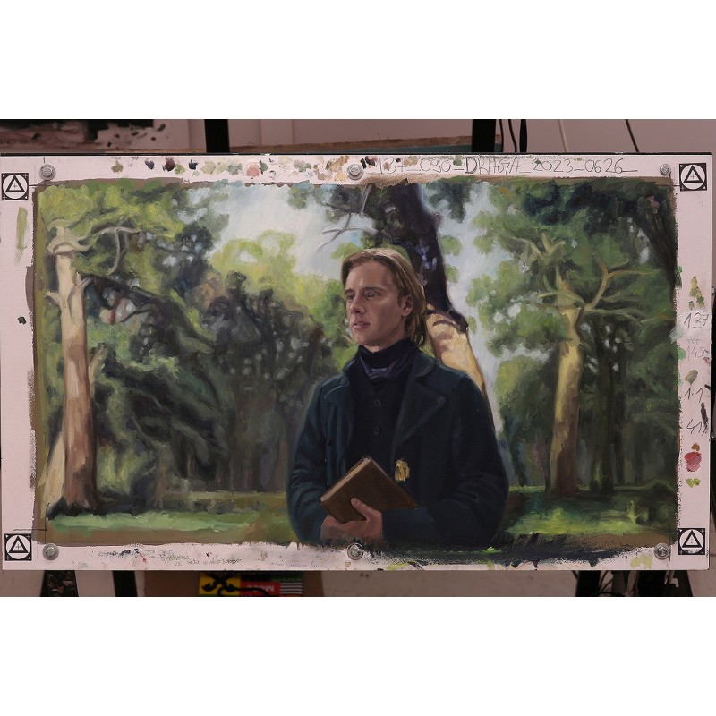 A wide shot from a scene in the forest. Although it is an “outdoor” scene, it was filmed entirely in a studio against a green and blue background. The only elements of the set design were grass and a piece of tree trunk that Jasio was leaning against. Throughout the scene, we used two paintings by Ivan Shishkin as inspiration for the background: “Oak Grove” from 1887 and “Rain in an Oak Forest” from 1891. The latter painting was used a little later for shots with Kozłowa. For the sequence with Jasio and Jagna, we used both the canvas “Oak Grove” and a 3D-generated environment. Jasio's pose at the beginning of the scene was loosely inspired by Wojciech Weiss's painting “Melancholic”. The shot was painted by Serbian artist Dragana Nikolic, who was very fond of shots with this actor. In total, she painted six shots with Maciej Musiał, including four from this scene.
