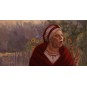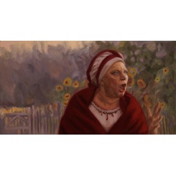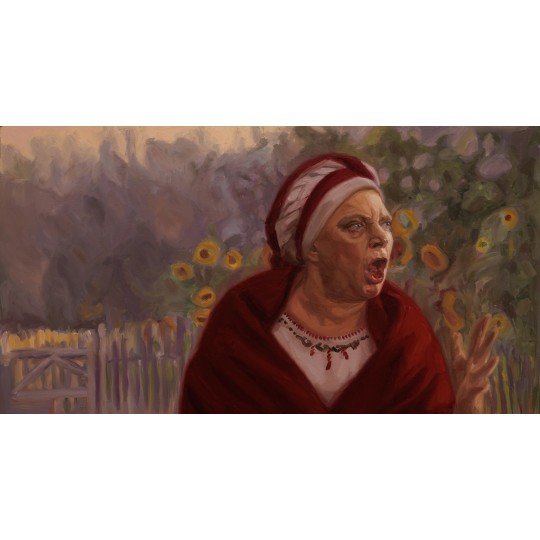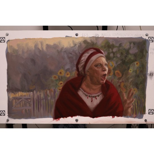 A close-up of Jagustynka outside the village mayor's house, during a meeting following the mayor's arrest. Jagustynka clearly distances herself from the rest of the villagers in her condemnation of Jagna and her refusal to accept that Jagna is entirely to blame for the money stolen from the till. Her anger is clearly visible, almost exaggerated, in her emotionally charged facial expression. The shot was filmed against a green screen, which has been replaced with an image loosely inspired by Jan Stanisławski’s ‘Sunflowers’.