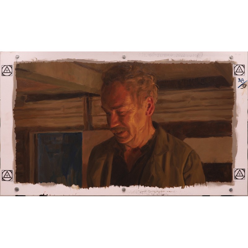 A portrait of the farmer from the scene ‘The Cabbage Party’. Boryna hands out glasses and pours the booze. After Jagusia’s refusal, he turns towards Jagustynka. A well-executed and intriguing portrait of the old farmer, painted by an artist who specialised in his portraits and produced at least several of them during the production. The protagonist’s face is turned to the left, hence the slight blurring of movement in the patches and shapes.