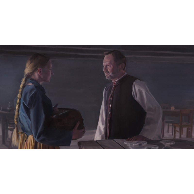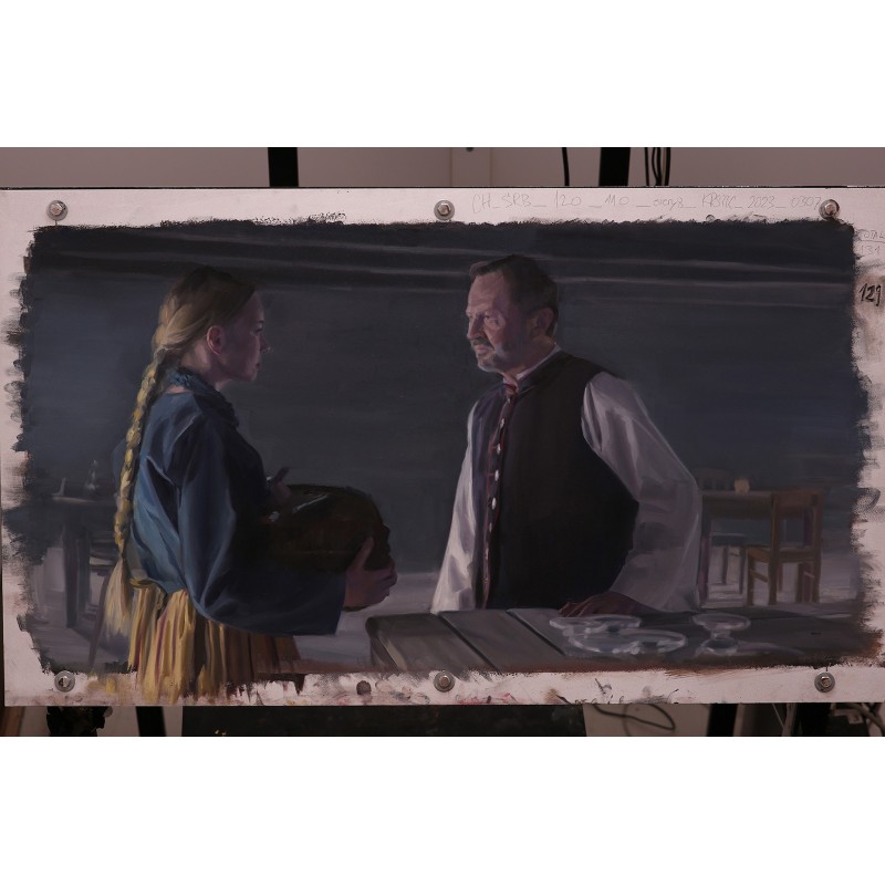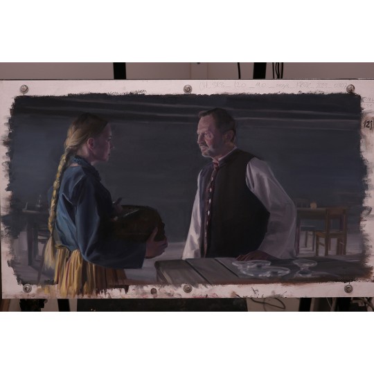 Obraz olejny z filmu Chłopi - "Wójt i Jagna z zakupami w karczmie".