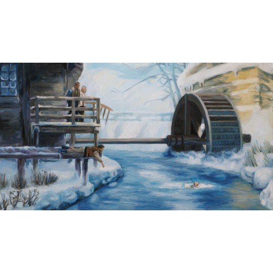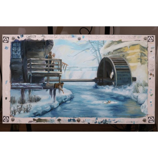 Szeroki kadr ze sceny w młynie. Przedstawiona klatka to ostatnie ujęcie (nr 290) tej sceny, namalowane przez Teodorę Dragan Nikolić. W filmie jest bliźniacze ujęcie (nr 250), namalowane na tym samym podobraziu, ale przez inną artystkę (choć o tym samym nazwisku) Dragę Nikolić. Samo ujęcie było niezwykle skomplikowane pod kątem produkcji. Materiał life action został bowiem nagrany latem w plenerze, na kładce nad wodą. Zarówno sam budynek młyna, koło młyńskie jak cała zimowa aura zostały dodane na etapie komponowania obrazu. Za inspirację posłużyły nam głównie trzy obrazy Ferdynanda Ruszczyca z wizerunkiem młyna w zimie.