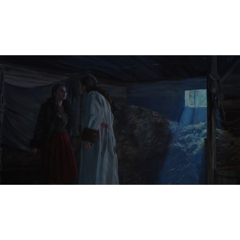 Szerokie ujęcie z dwójką kochanków. Bardzo szczegółowo odmalowana scenografia wnętrza stodoły i detale samych postaci, co nie było łatwe ze względu na dość małe (względem wielkości kadru) twarze aktorów i słabe oświetlenie sceny.