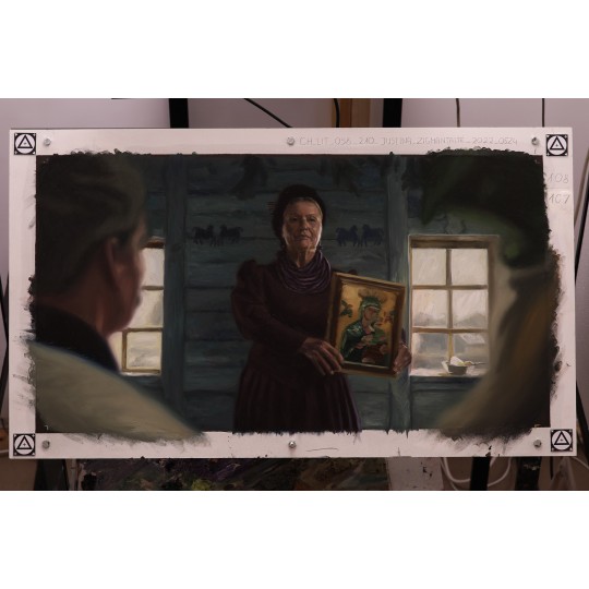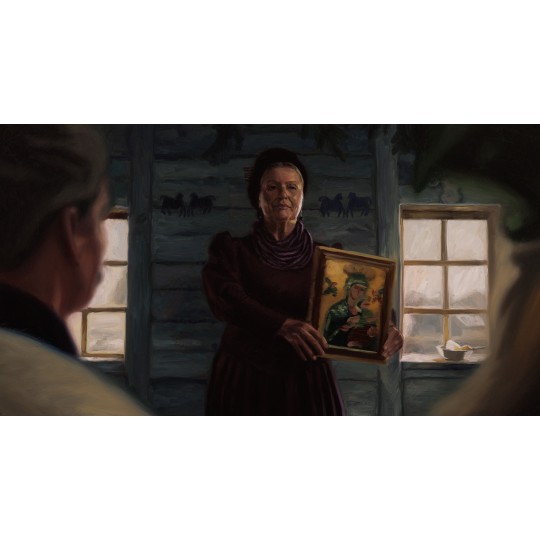 „... i przyklęknęli, a matka obrazem ich przeżegnała i jęła błogosławić, i wodą święconą kropić ...” Ujęcie nagrane w studiu w scenografii. Zielone tła za oknami zostały zastąpione pejzażem wsi. Ujęcie namalowane przez artystkę z Litwy.