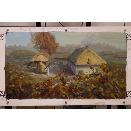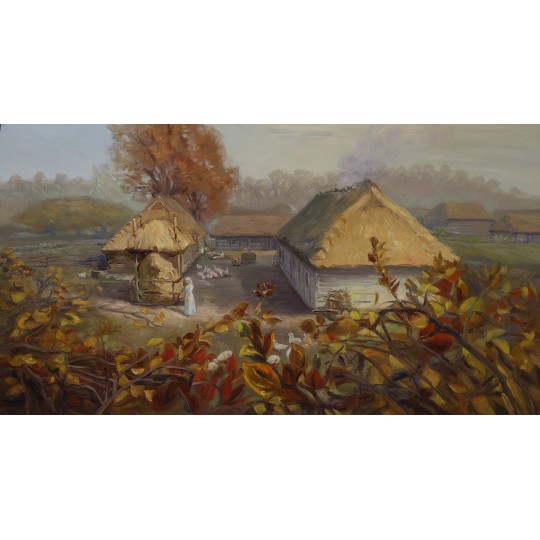 Obraz olejny z filmu Chłopi - "Gospodarstwo Boryny. Widok znad sadu".