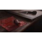 Zbliżenie na fragment stołu z wycinankami Jagny i kieliszkiem rozlanej wódki.