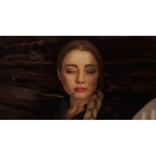 Pięknie namalowany portret głównej bohaterki ze sceny rozmowy z Mateuszem. Boczne źródło światła oświetlające jej twarz sprawia, jakby twarz Jagny wychodziła z cienia, w jakim ukryta jest ściana za nią. Ten zabieg dodatkowo potęguję skupienie widza na wizerunku bohaterki i emocjach, jakie wyraża.
